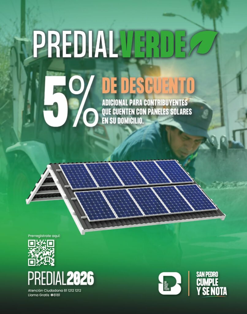 El Municipio de San Pedro Garza García informa que ya está habilitado el espacio para el prerregistro del programa Predial Verde, dirigido a contribuyentes que cuenten con paneles solares en su casa-habitación y deseen acceder al 5 por ciento de descuento en el Impuesto Predial 2026.
